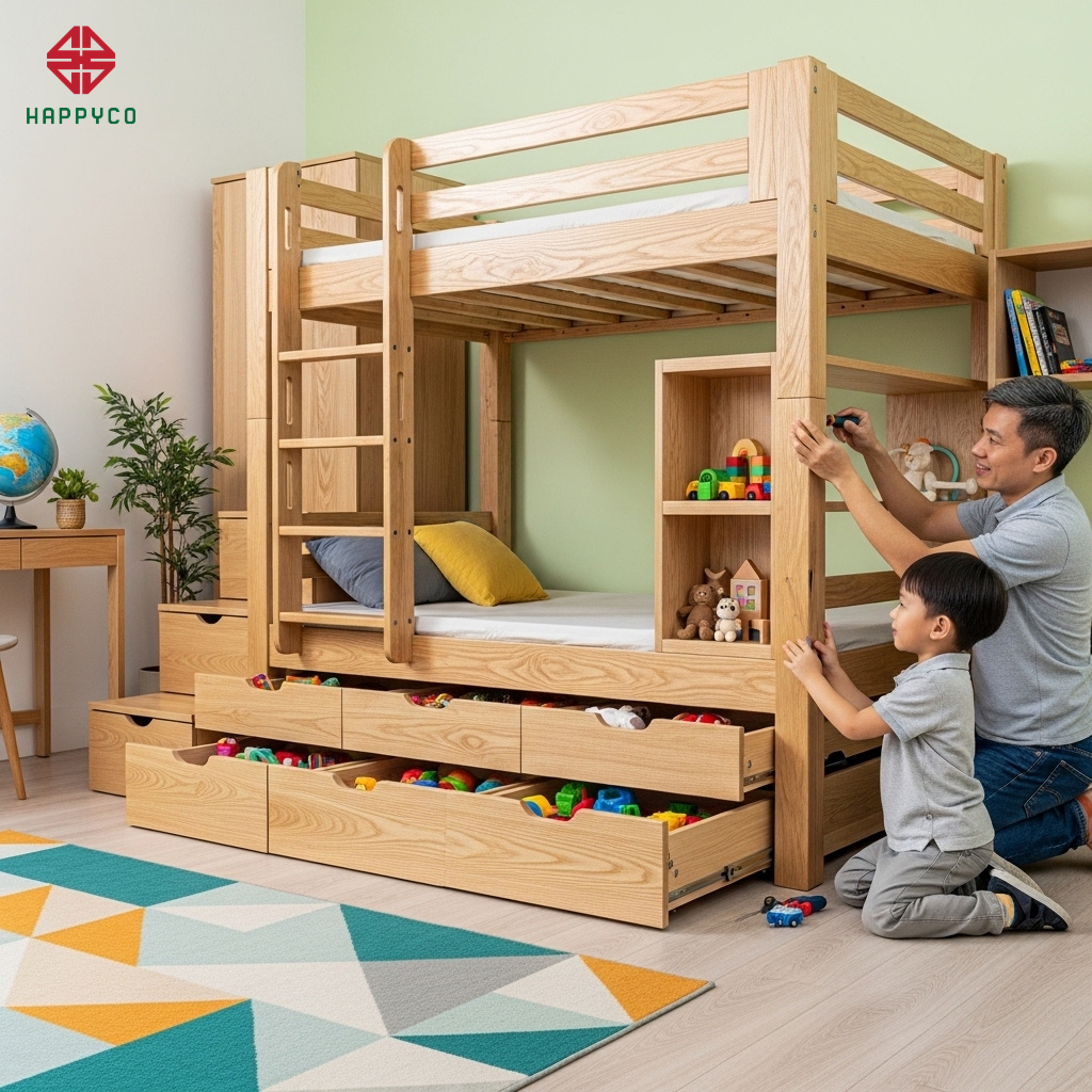 Cấu trúc kỹ thuật: Hệ giường được cấu tạo từ các khối mộc độc lập. Giai đoạn đầu, nó có thể là giường đơn kết hợp quây bảo vệ an toàn. Khi con lớn hơn, các module hộc kéo phía dưới được tái sắp xếp để mở rộng diện tích nằm hoặc tích hợp thêm giường tầng phía trên bằng hệ thang mộc chắc chắn.