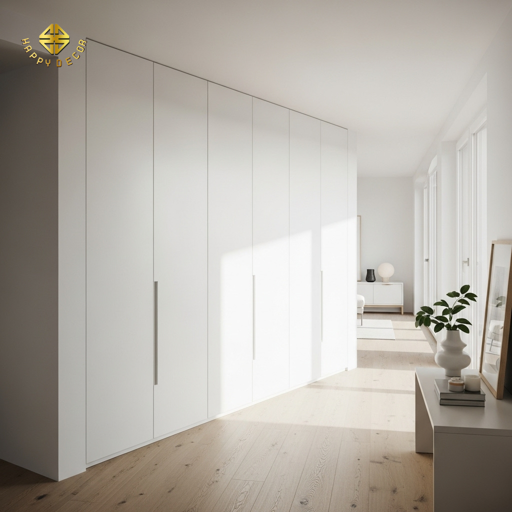 Giải pháp nội thất: Thay vì sử dụng nhiều kệ rời, hãy thiết kế các hệ tủ kịch trần chạy dài dọc theo tường. Sử dụng cánh tủ phẳng, không tay nắm (push-to-open) và cùng màu với tường (thường là trắng hoặc xám nhạt).
