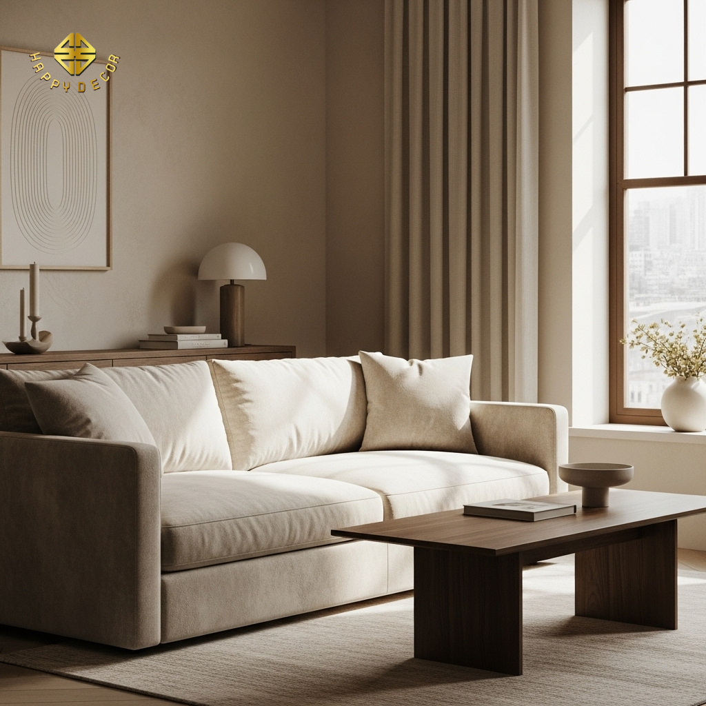 Cách phối màu: Hãy chọn một tông màu chủ đạo (ví dụ: màu Beige hoặc màu kem) và triển khai nó trên nhiều sắc độ khác nhau: từ rèm cửa, sofa đến màu gỗ Melamine của tủ.