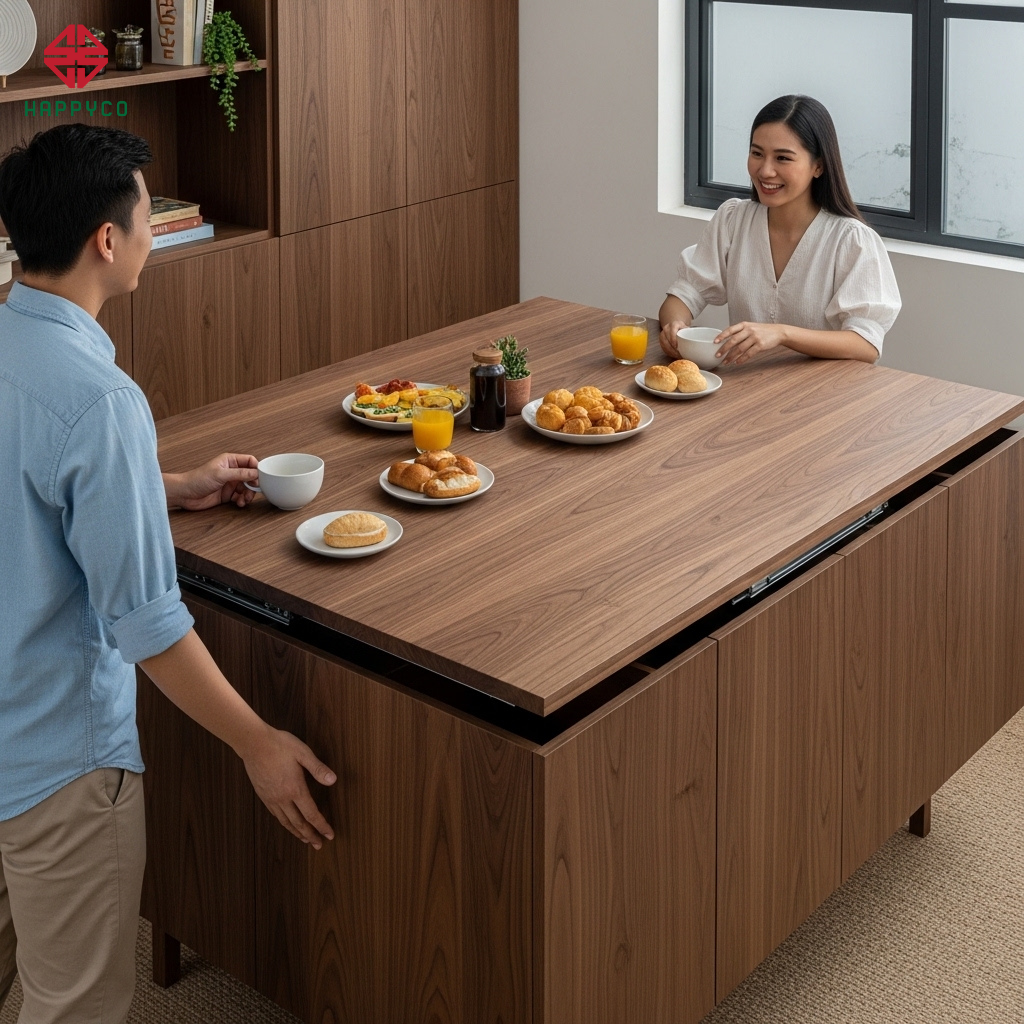 Cơ chế xoay Pivot: Chúng tôi thi công hệ bàn lớn được giấu một phần trong tủ mộc. Khi cần, gia chủ có thể xoay bàn ra ngoài 90 độ để biến phòng khách thành phòng họp gia đình hoặc không gian ăn nhanh. Khi đóng lại, nó hoàn toàn phẳng phiêu và tiết kiệm diện tích.