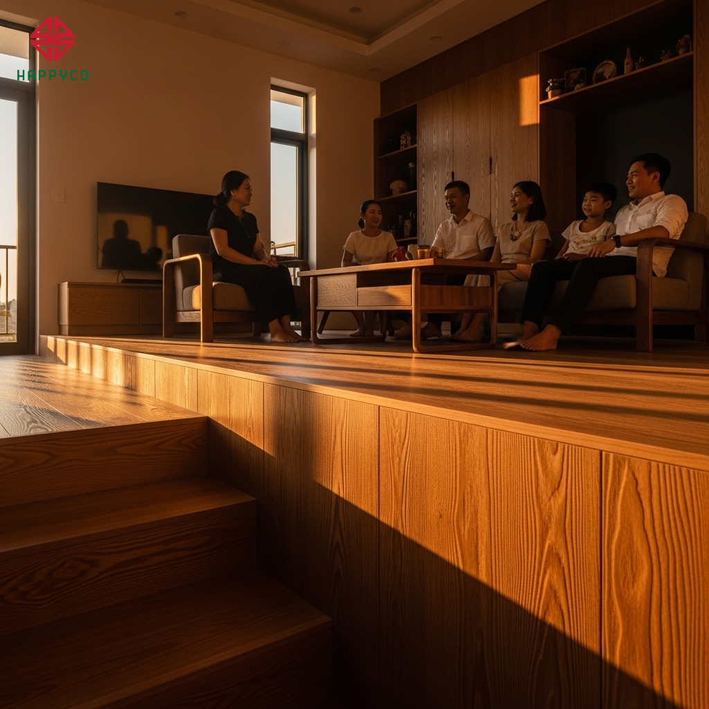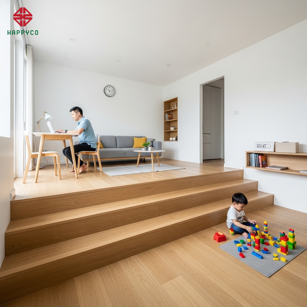 Tác động tâm lý: Sự thay đổi về cao độ sàn mộc tạo ra một ranh giới tâm lý nhẹ nhàng. Con trẻ có thể chơi đùa ở vùng sàn thấp, trong khi cha mẹ ngồi làm việc trên vùng sàn cao. Họ vẫn nhìn thấy nhau, vẫn nghe thấy tiếng cười của nhau, nhưng không gian làm việc và vui chơi vẫn có sự tách biệt chuyên nghiệp.