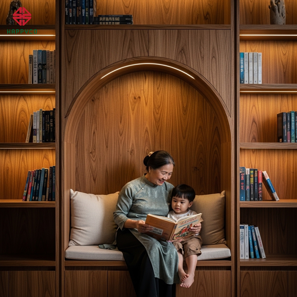 Giá trị kết nối: Đây là nơi ông bà có thể ngồi đọc truyện cho cháu, nơi hai vợ chồng có thể cùng nhau thưởng thức tách cà phê sáng. Việc đưa con người "nhập" vào bên trong món đồ nội thất mộc giúp xóa tan cảm giác xa cách, biến hệ tủ thành một thực thể sống động, khuyến khích sự tương tác giữa các thế hệ.