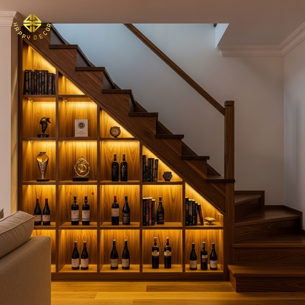 Nếu cầu thang nằm ở vị trí dễ quan sát như phòng khách, hãy biến nó thành một tủ trưng bày thay vì kho chứa đồ cũ.