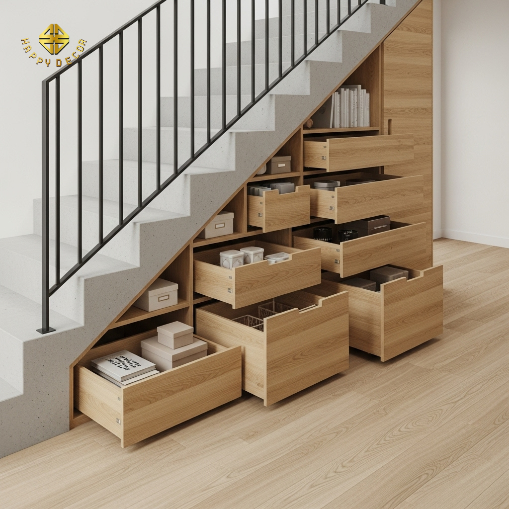 Giải pháp đúng: Gầm cầu thang chỉ nên dành cho những hoạt động "Tĩnh" như kho chứa đồ, tủ giày hoặc tủ trang trí. Nếu muốn làm tiểu cảnh, hãy ưu tiên tiểu cảnh khô (đá, cây nhựa cao cấp) thay vì tiểu cảnh nước (bể cá) để tránh ẩm mốc và âm khí quá vượng.
