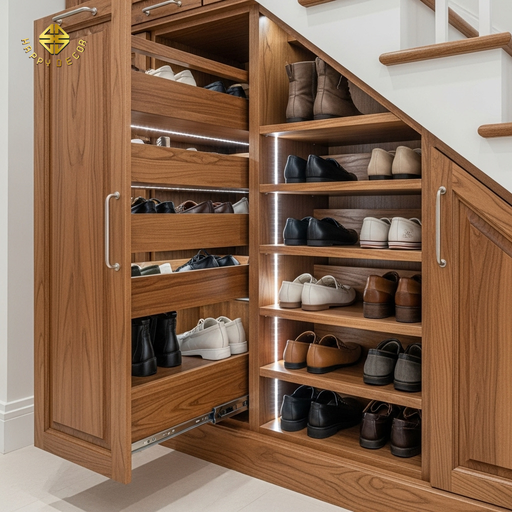 Phong thủy gầm cầu thang: biến "góc chết" thành kho tàng tài lộc bằng nội thất gỗ thông minh