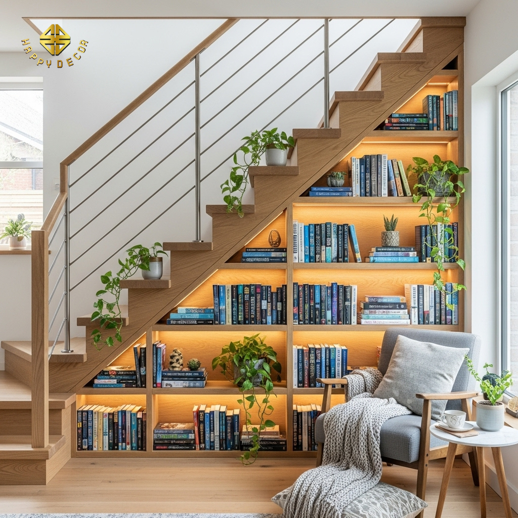 2. Kệ sách dưới cầu thang – Kích hoạt cung "Tri thức"