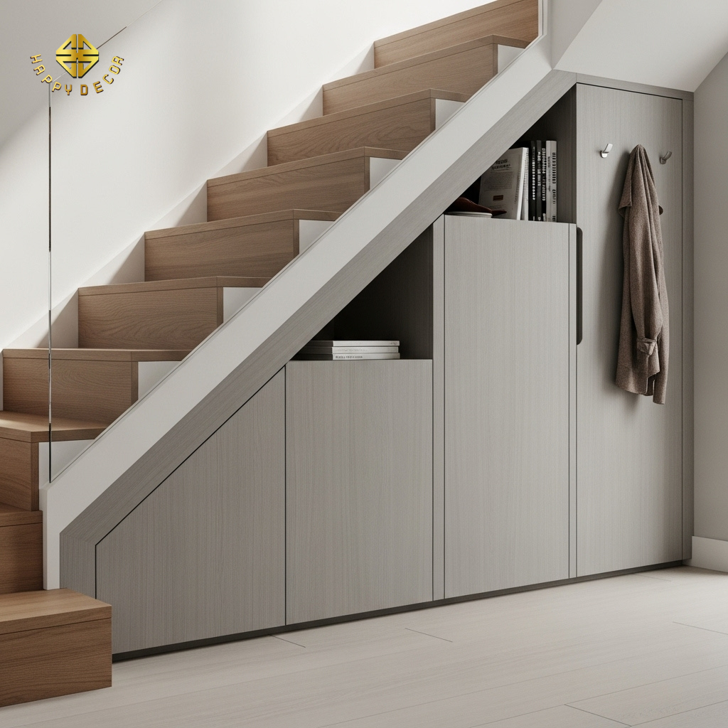 Tác dụng: Tủ gỗ kịch trần che kín gầm cầu thang giúp ngăn chặn bụi bẩn và giấu đi những món đồ lộn xộn. Việc "đóng kín" vùng này giúp dòng khí trong nhà lưu thông trơn tru hơn dọc theo lối đi chính mà không bị khựng lại ở góc tối.