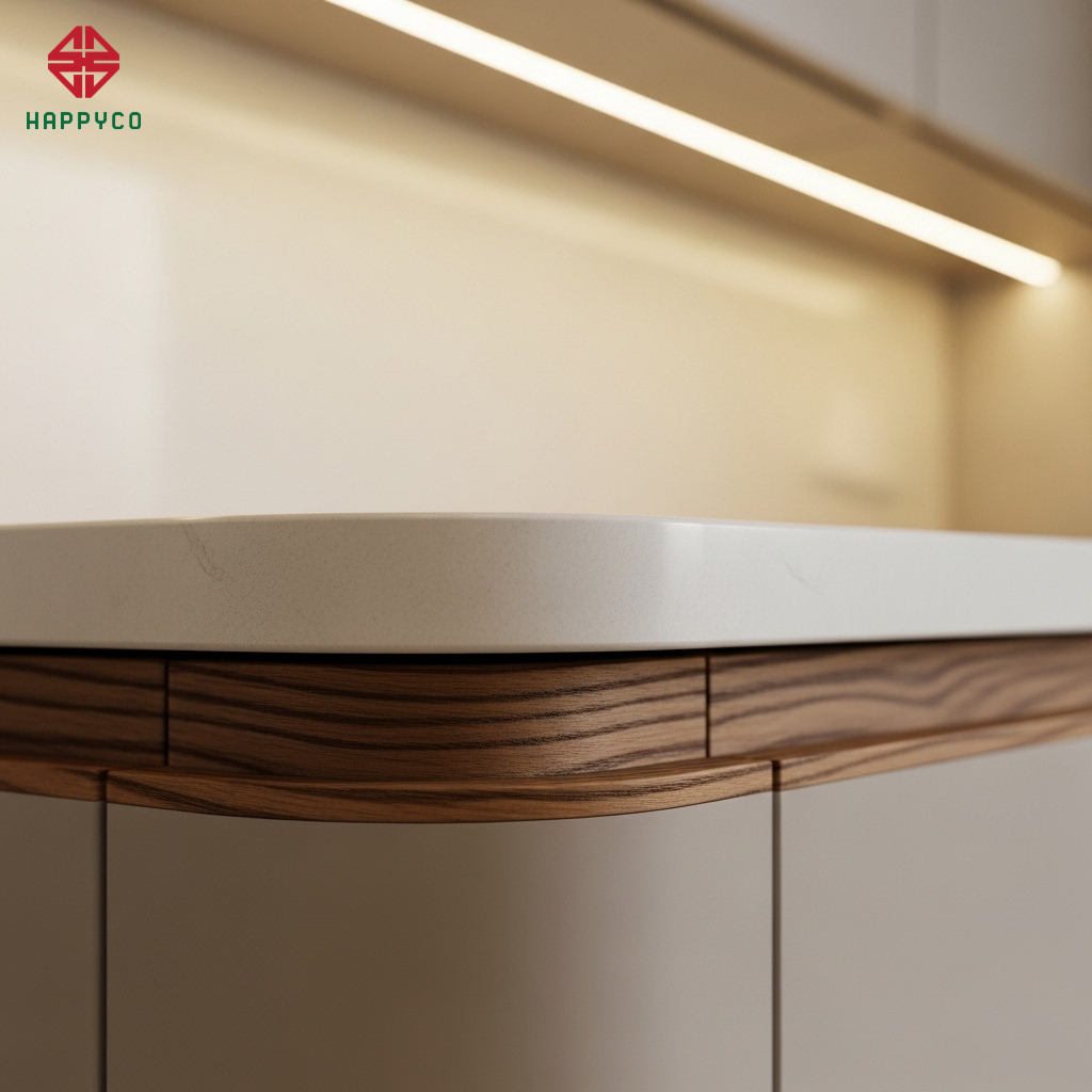 Kỹ thuật bo góc tinh tế: Tại Happyco, các góc cạnh tủ bếp và mặt đá đều được chúng tôi xử lý bo tròn hoặc vát cạnh mềm mại. Kỹ thuật thi công khít khao milimet giúp không gian bếp liền mạch, trơn tru, biểu trưng cho mọi việc trong gia đình đều "xuôi chèo mát mái".