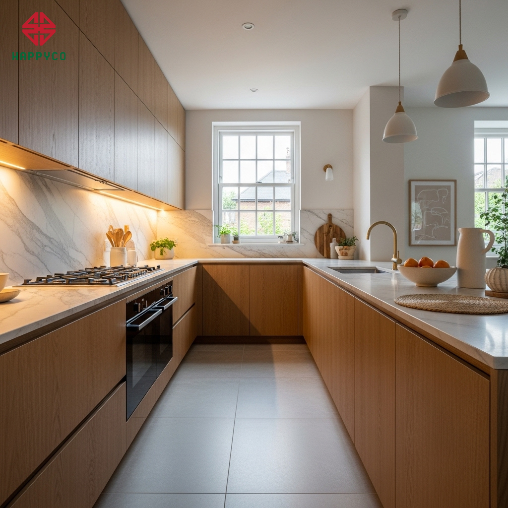 Mộc dưỡng Hỏa: Happyco ưu tiên sử dụng vật liệu gỗ (hành Mộc) với các tông màu trung tính như nâu sồi, vân gỗ ấm hoặc trắng kem. Mộc sinh Hỏa không chỉ giúp không gian bếp thêm ấm cúng mà còn thúc đẩy sức khỏe và sự sung túc cho các thành viên.