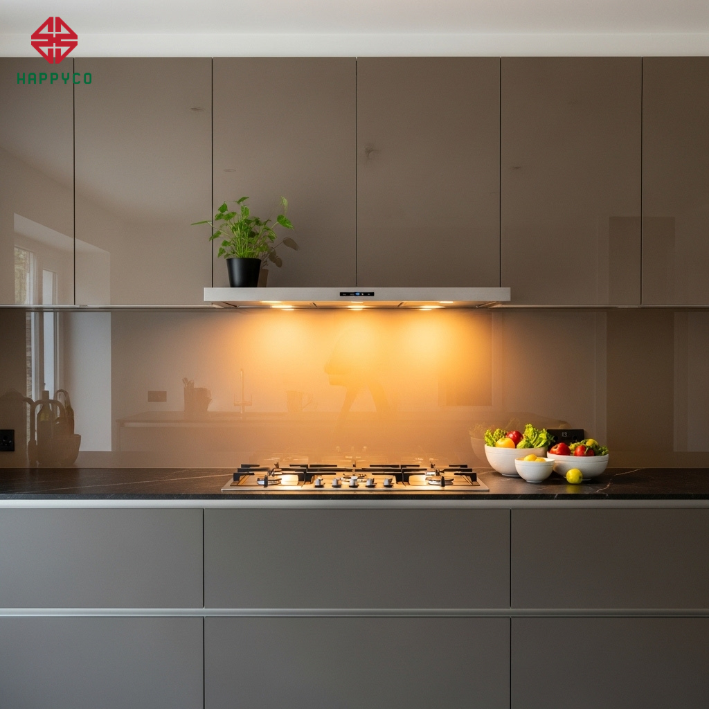 Ánh sáng tụ khí: Hệ thống đèn LED dưới tủ bếp được Happyco thi công để đảm bảo gian bếp luôn sáng sủa, không có góc khuất tăm tối, giúp tài lộc luôn được soi sáng và hội tụ.