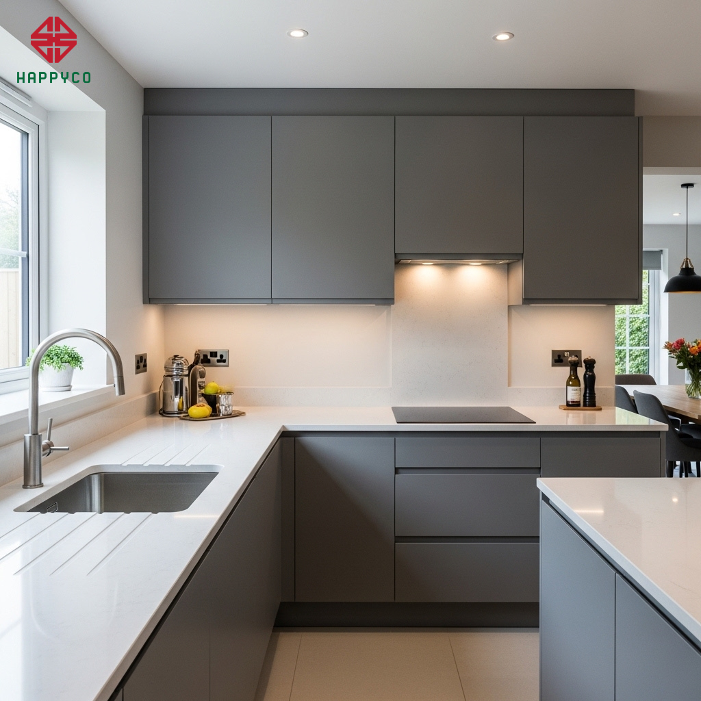 Khoảng cách an toàn: Happyco luôn tính toán khoảng cách giữa bếp nấu (Hỏa) và chậu rửa (Thủy) tối thiểu là 60cm. Sự ngăn cách này giúp dòng khí trong bếp không bị xung đột, giữ cho gia đạo luôn hòa thuận, tránh những tranh cãi không đáng có.