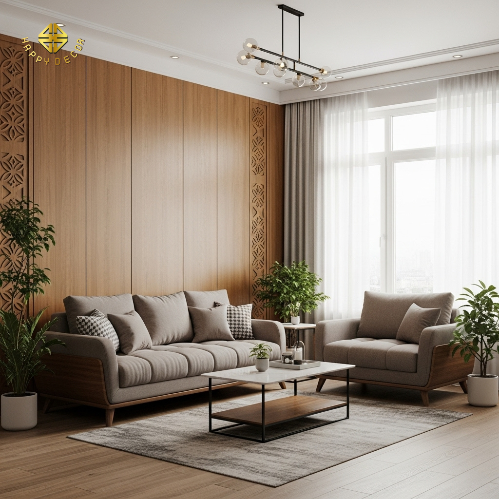 Ánh sáng và hành Mộc: Phòng khách nên sử dụng gỗ tông màu sáng để khuếch tán ánh sáng tự nhiên. Mộc sinh Hỏa (năng lượng tích cực), việc sử dụng các đường vân gỗ uốn lượn tự nhiên giúp dòng khí luân chuyển nhẹ nhàng, tránh bị "đọng" khí ở các góc chết.