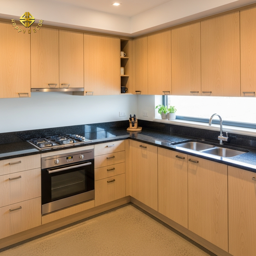 Hướng bếp và sự riêng tư: Bếp không được nhìn thẳng ra cửa chính hoặc đối diện nhà vệ sinh. Mùi thức ăn và luồng khí không sạch sẽ từ nhà vệ sinh sẽ làm "ô nhiễm" nguồn năng lượng nuôi dưỡng gia đình. Sử dụng hệ tủ bếp kịch trần để che đi các đà ngang (xà nhà) đè lên bếp, giúp giải tỏa áp lực cho người nội trợ.