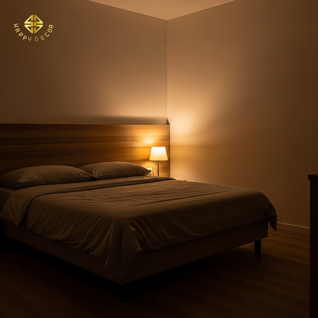 Vị trí giường ngủ - Quy tắc sống còn: Giường ngủ không được đặt đối diện cửa ra vào (Vị trí quan tài) và đầu giường không được tựa vào tường nhà vệ sinh. Nếu diện tích bắt buộc phải đặt như vậy, hãy sử dụng một vách ốp đầu giường bằng gỗ dày để tạo sự ngăn cách điện từ và âm thanh hiệu quả.