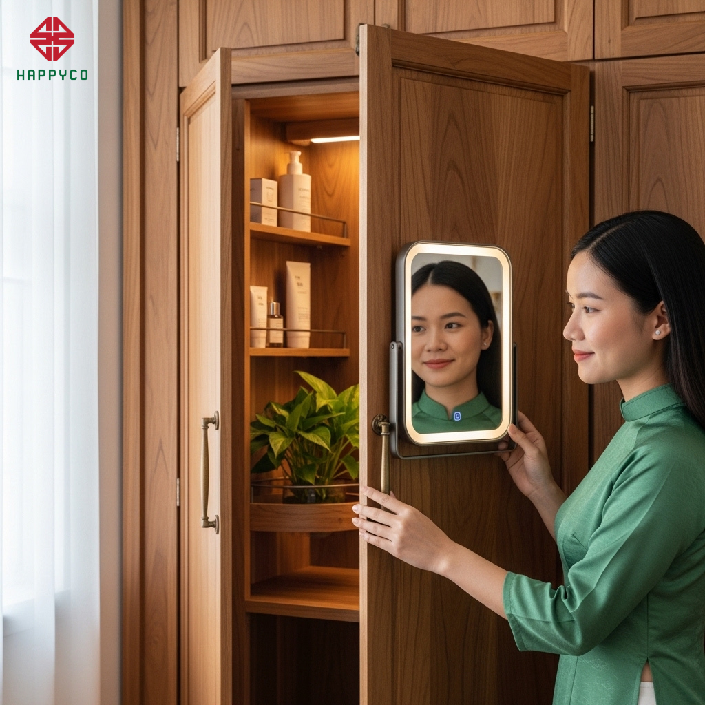 Giải pháp mộc thông minh: Chúng tôi tích hợp gương vào bên trong cánh tủ áo (dạng xoay) hoặc thiết kế hệ tủ trang điểm có nắp đậy mộc.