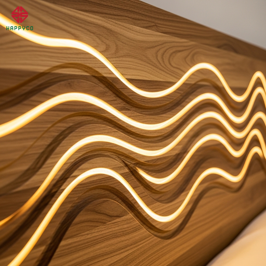 Lựa chọn bề mặt: Happy Décor sử dụng các dòng Melamine hoặc Veneer gỗ tự nhiên từ Kho Mộc với tông màu trung tính như nâu đất, kem cát hoặc xám nhạt. Ánh sáng đèn LED được giấu kín trong các khe phay CNC trên đầu giường hoặc đáy tủ, tỏa ra ánh sáng gián tiếp êm dịu.