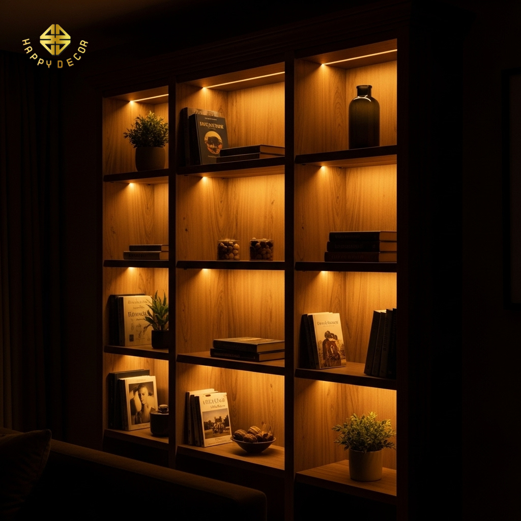 Bố trí: Ánh sáng được giấu tinh tế phía sau các hệ vách gỗ (Indirect lighting) hoặc bên trong các hốc tủ trưng bày.