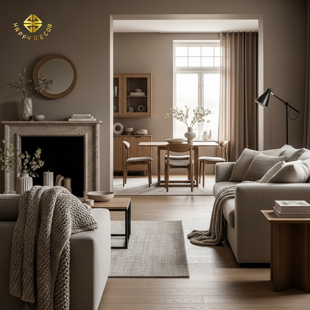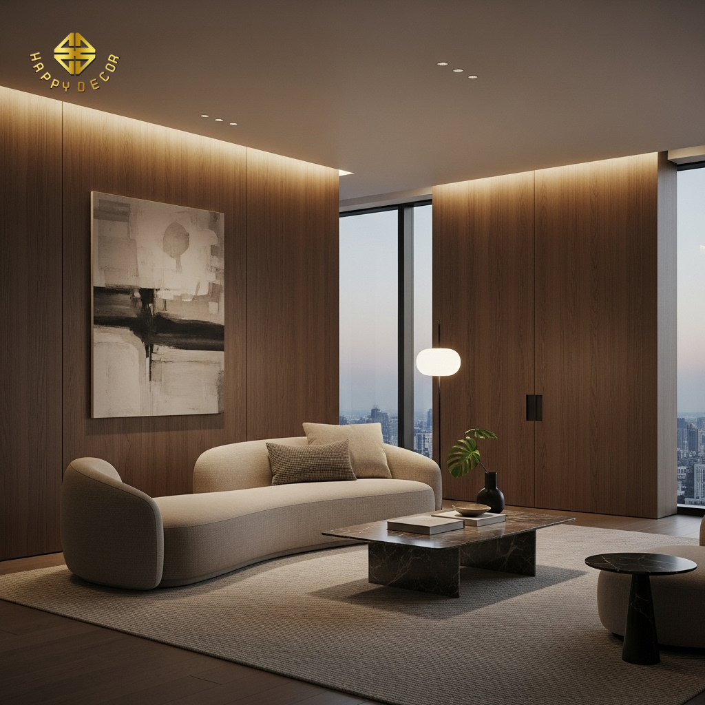 Chiều sâu: Để tránh sự đơn điệu, Happy Décor sử dụng sự khác biệt về vật liệu: một chiếc sofa nỉ thô đặt cạnh một bức vách gỗ Melamine vân sần, trên nền sàn gỗ mịn. Sự phong phú về xúc giác này tạo nên sự sang trọng đầy chiều sâu mà ít phong cách nào có được.