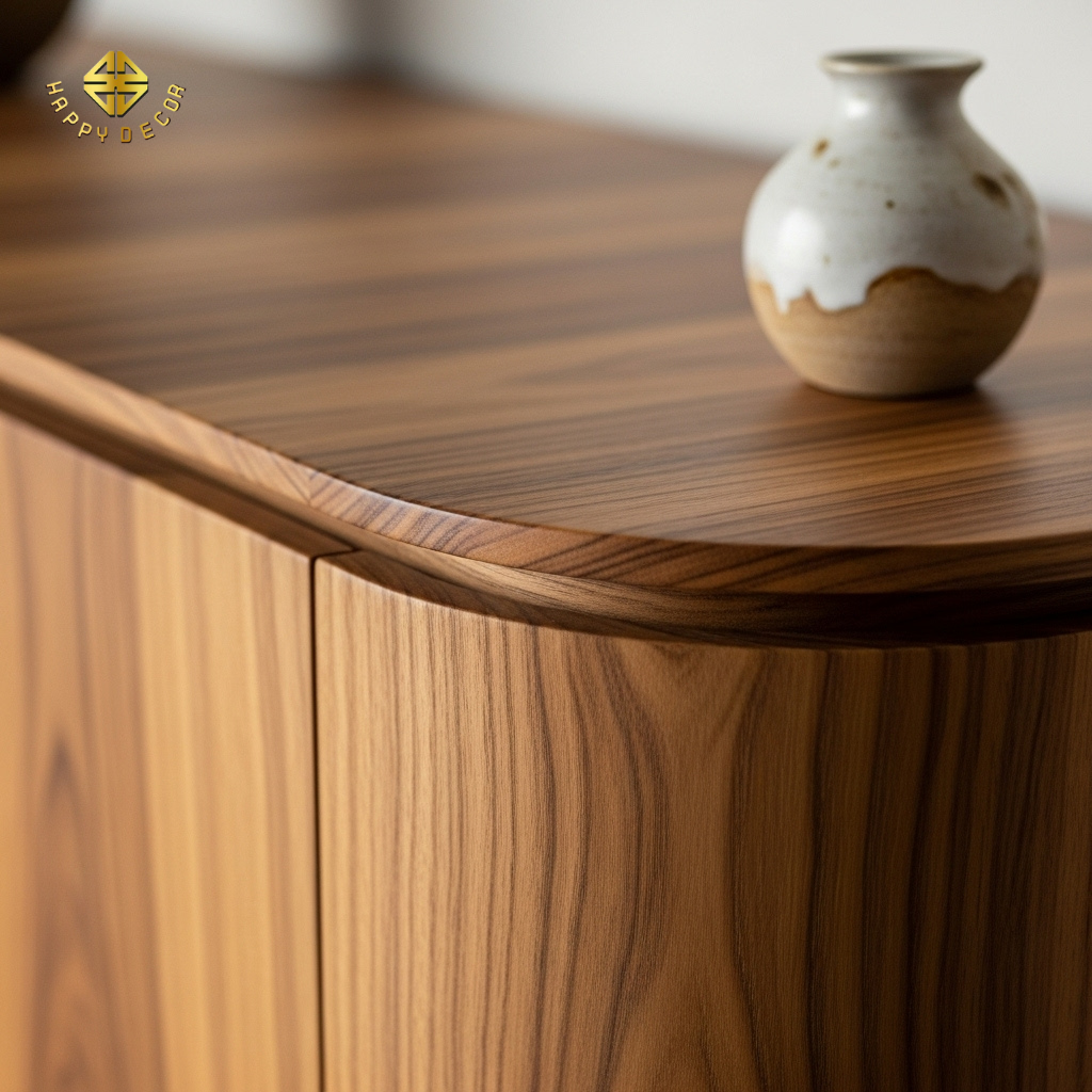 Kỹ thuật: Thay vì những góc cạnh nhọn sắc, các hệ tủ được bo cong mềm mại (Curved furniture). Các điểm nối giữa các tấm gỗ được xử lý bằng kỹ thuật ghép 45 độ hoặc mòi chỉ để tạo sự liền mạch tuyệt đối.