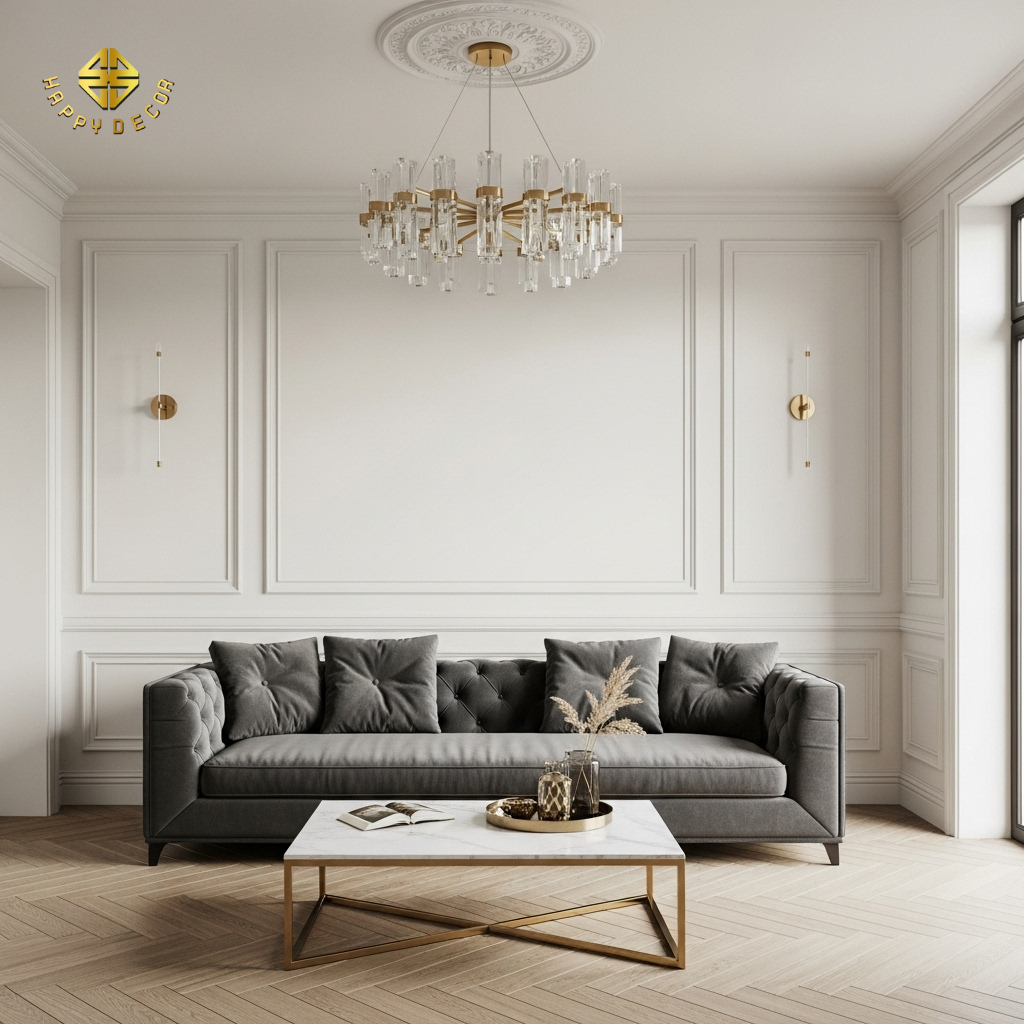 Phào chỉ tinh giản: Thay vì những mẫu phào hoa văn uốn lượn phức tạp, Modern Classic ưu tiên phào chỉ trơn, mảnh với tiết diện đơn giản. Các ô huỳnh trên tường được chia theo tỷ lệ vàng $1:1.618$ hoặc các tỷ lệ cân xứng, tạo nên nhịp điệu và chiều sâu cho diện tường mà không gây rối mắt.