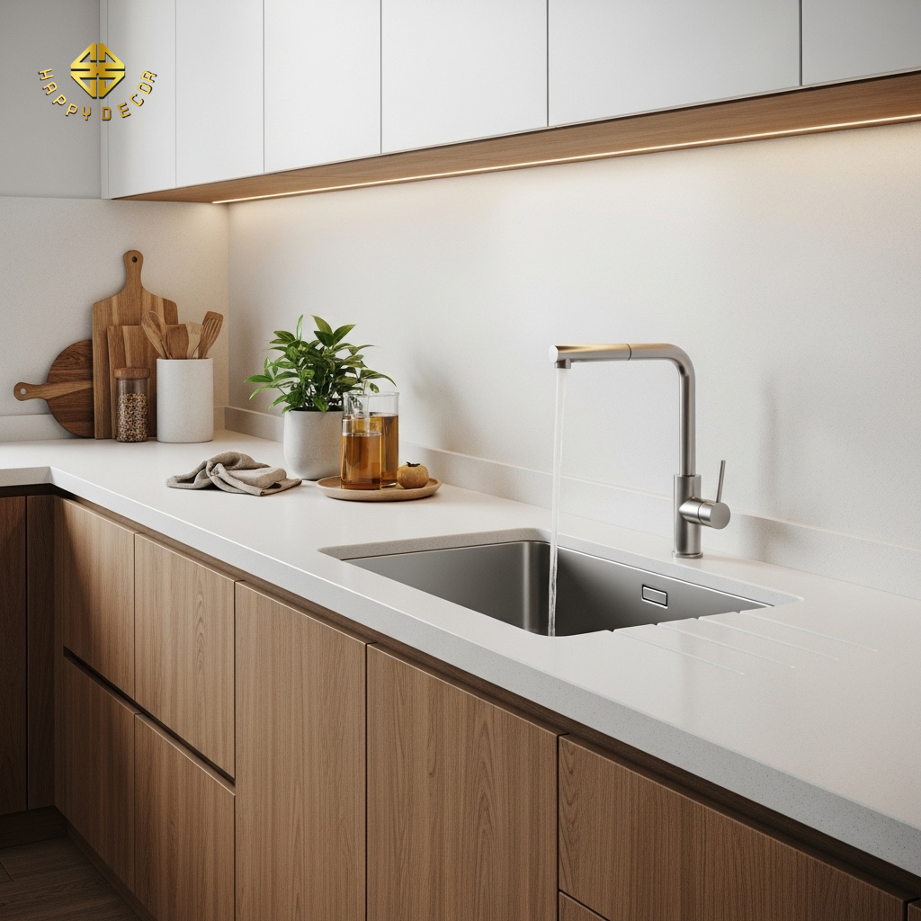 Tích hợp: Chậu rửa Inox được hàn liền hoặc dán âm toàn phần với mặt đá, tạo nên một bề mặt phẳng tuyệt đối. Nước thừa chỉ có một lối thoát duy nhất là xuống cống, không bao giờ có cơ hội tiếp xúc với các linh kiện gỗ phía dưới.