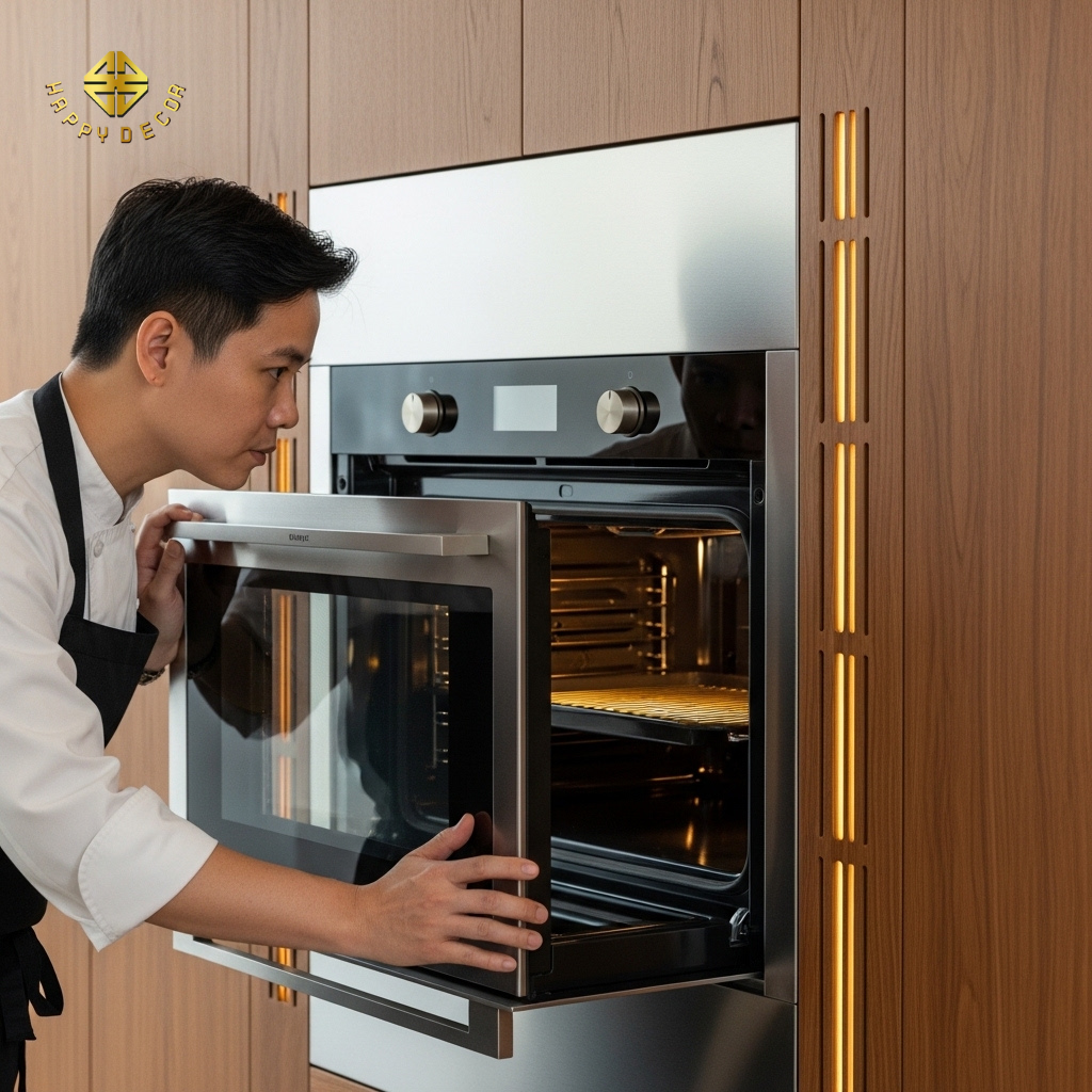 Cấu trúc ngăn cách: Giữa các khoang lò nướng, bếp từ và thùng tủ inox được chèn lớp vật liệu cách nhiệt và khe tản nhiệt thông minh.