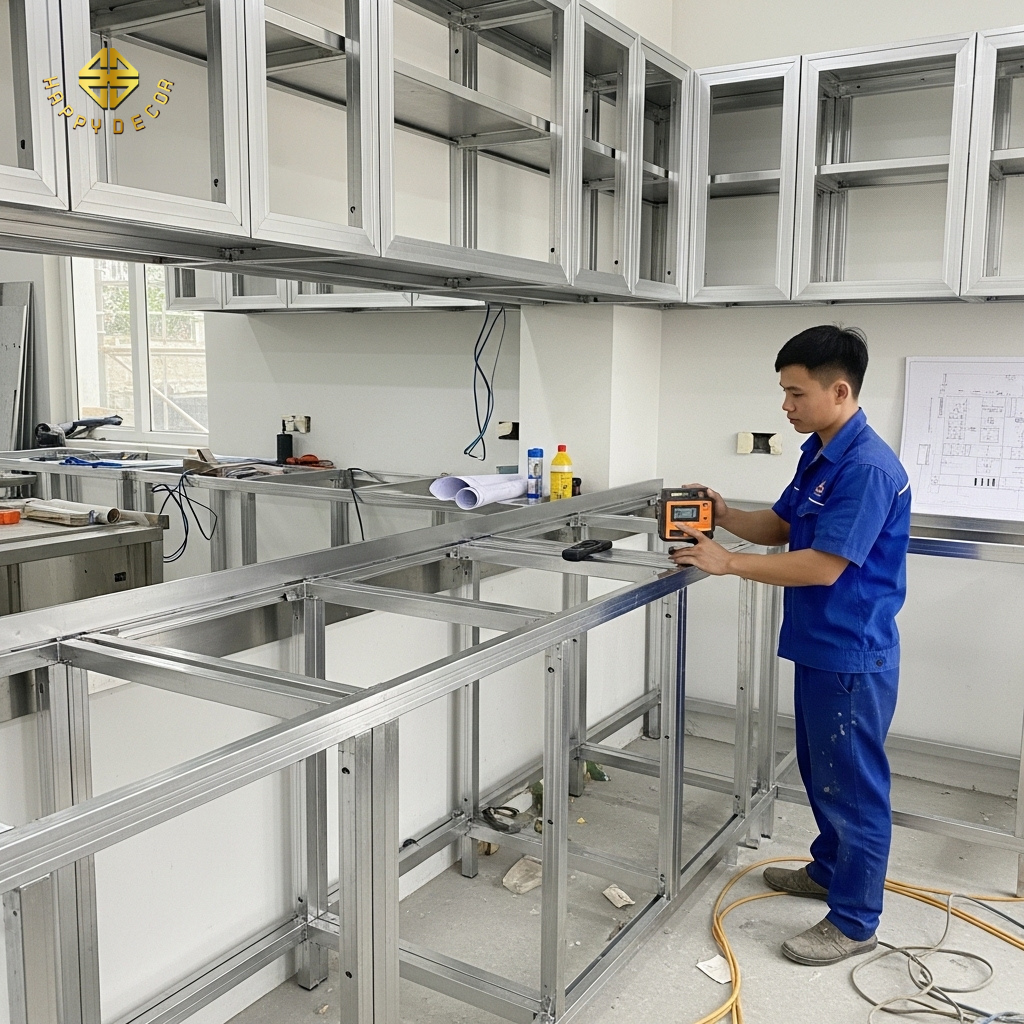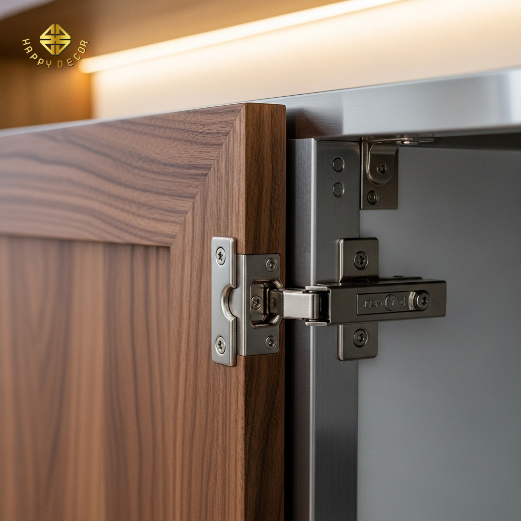 Kỹ thuật lắp đặt: Happy Décor ứng dụng hệ tay bắt và bản lề chuyên dụng để kết nối giữa cánh gỗ và thùng Inox.