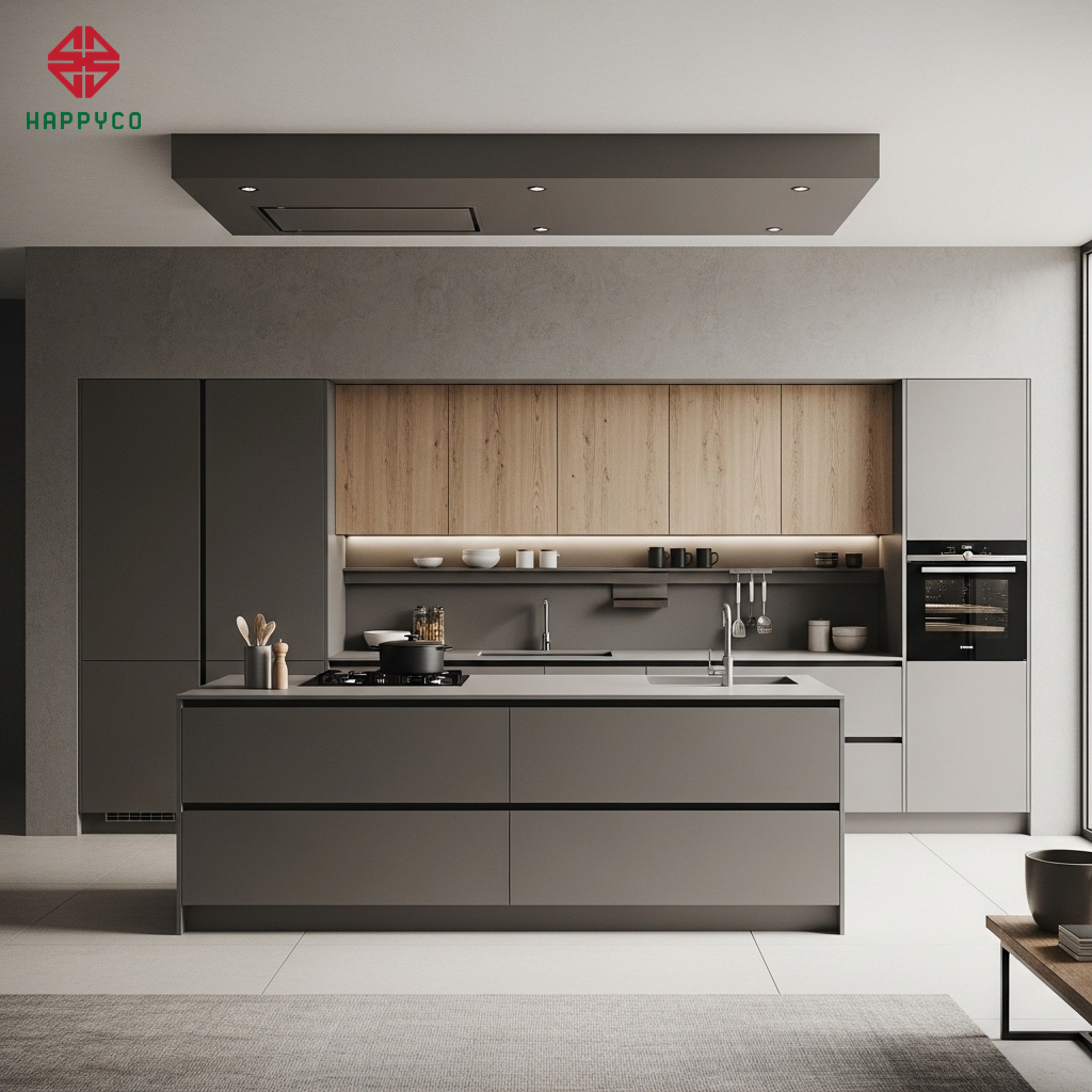Thiết kế phẳng kịch trần: Happyco thi công các hệ tủ bếp trên kịch trần, không chỉ tăng gấp đôi không gian lưu trữ mà còn loại bỏ hoàn toàn việc bụi bẩn bám trên đỉnh tủ.