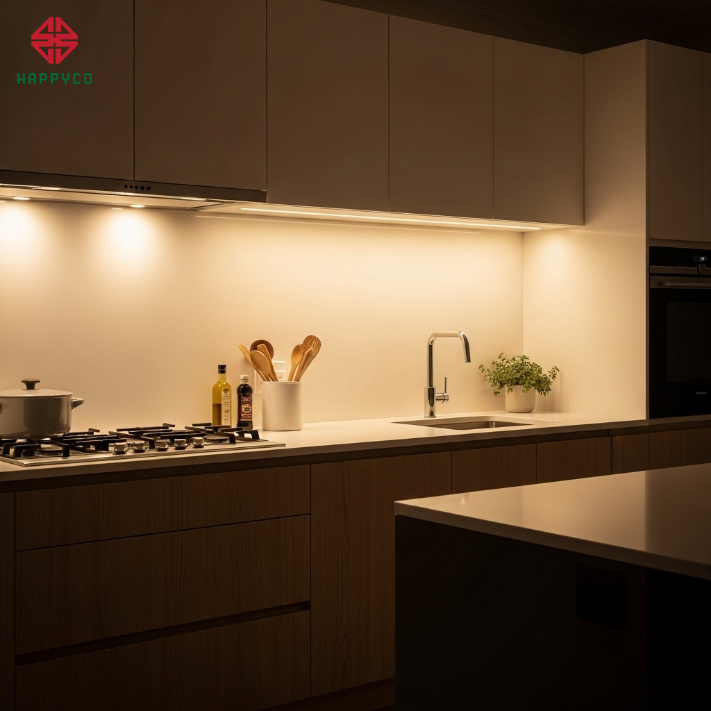 LED hắt dưới tủ trên: Happyco thi công hệ thống đèn LED âm tinh tế ngay dưới đáy tủ trên, rọi thẳng xuống mặt đá bếp. Điều này không chỉ giúp việc chế biến thực phẩm chính xác hơn mà còn tạo nên hiệu ứng lung linh, thôi miên thị giác vào ban đêm.