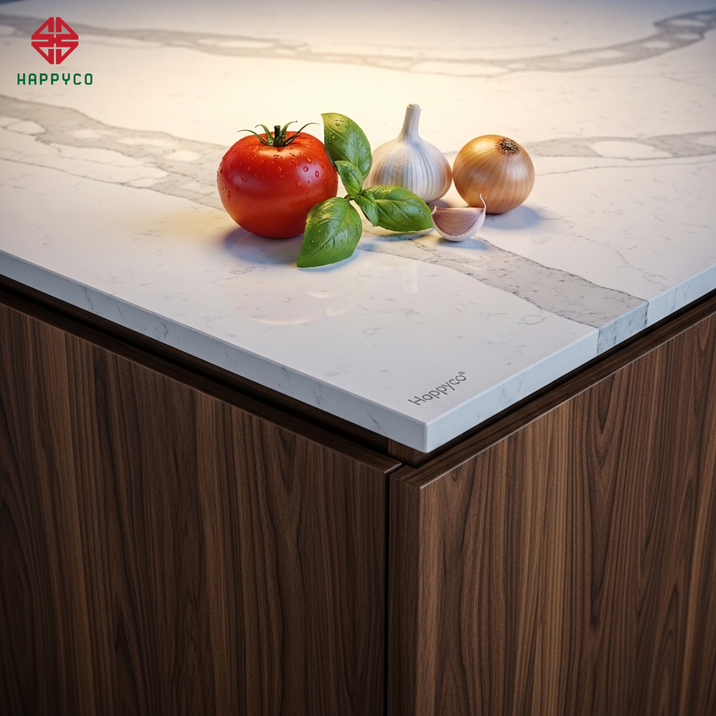 Bề mặt đá thạch anh và nung kết: Chúng tôi ưu tiên các loại đá có độ cứng cao, chống thấm ố và kháng khuẩn tuyệt đối. Sự kết hợp giữa đá và gỗ dưới bàn tay thi công của Happyco tạo nên một không gian vừa ấm áp, vừa sạch sẽ và vô cùng sang trọng.