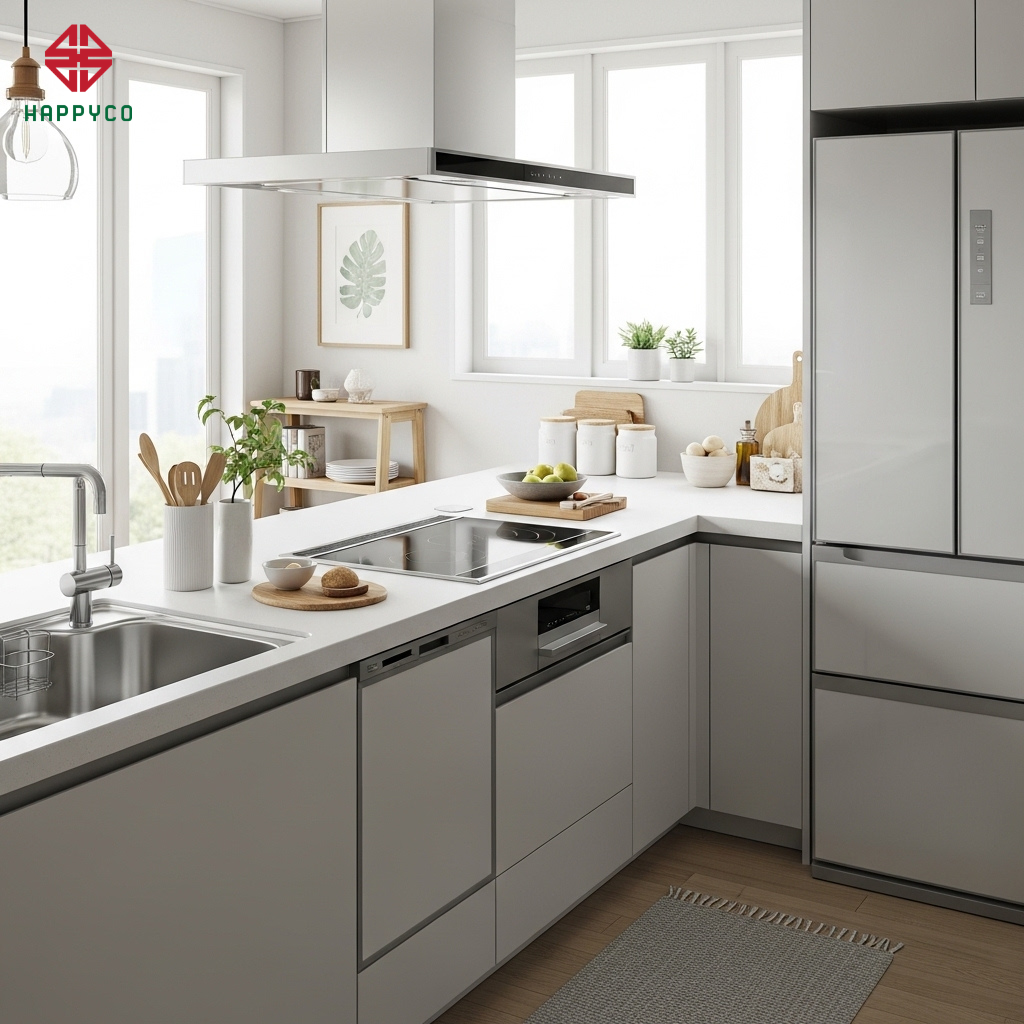 Cốt ván siêu chống ẩm: Happyco sử dụng 100% ván kháng ẩm cao cấp cho hệ tủ bếp, đảm bảo không cong vênh, mối mọt dù trong môi trường ẩm ướt thường xuyên.
