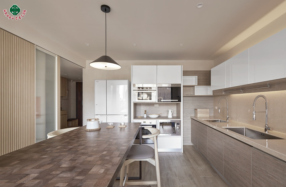 Bếp theo phong cách Đài Loan thường sử dụng hệ tủ bếp tối giản, kết hợp với bàn ăn bằng gỗ hoặc đá để tạo sự hài hòa. Các thiết kế phổ biến: