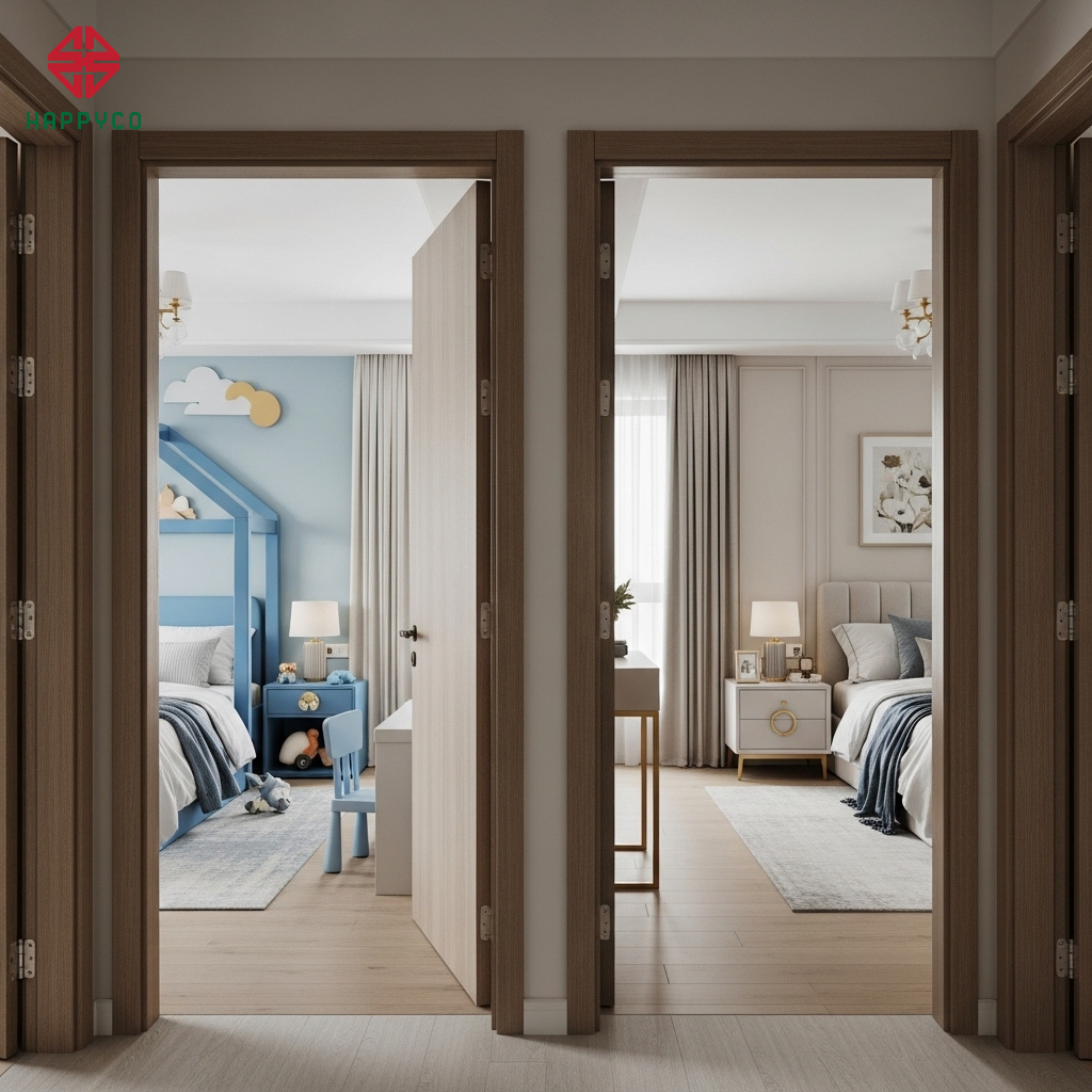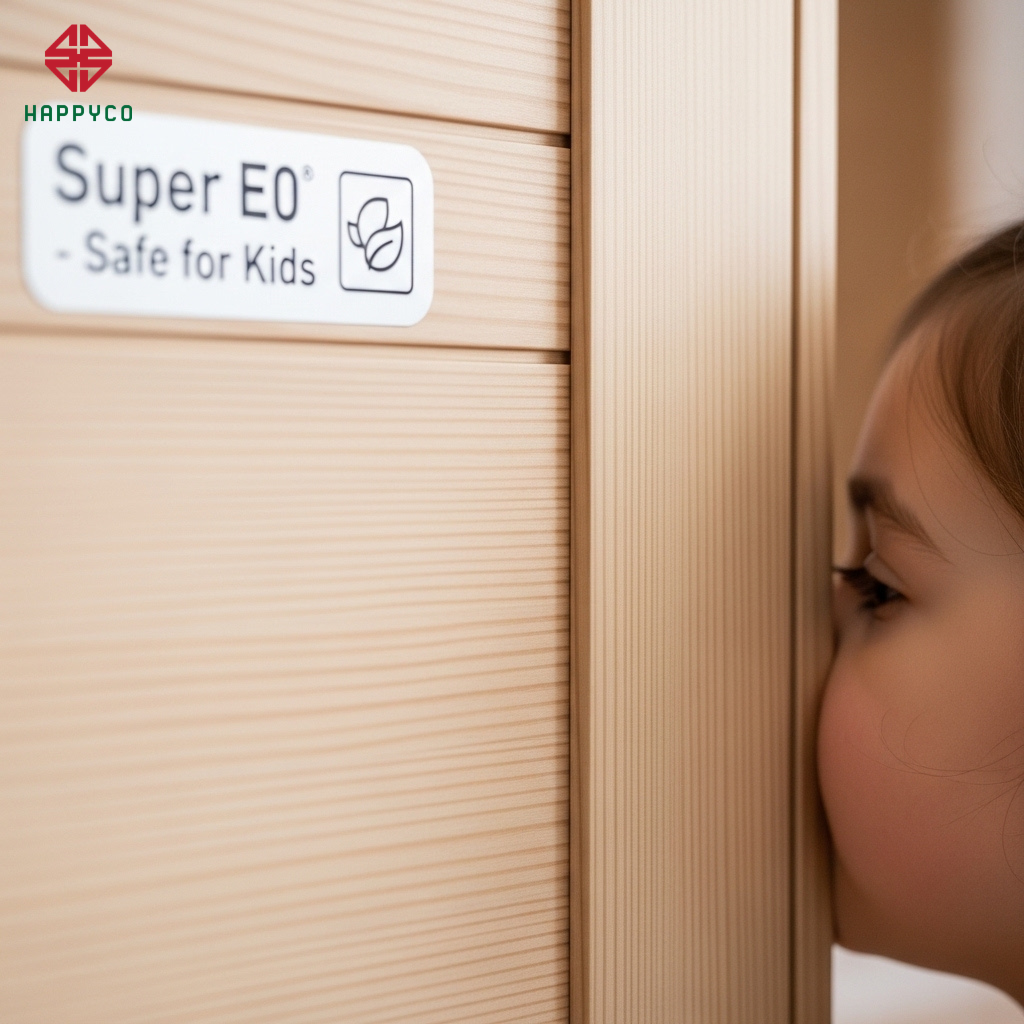 Lựa chọn ván sạch Super E0: Happy Décor ưu tiên sử dụng cốt ván HMR lõi xanh từ Kho Mộc đạt chuẩn Super E0. Việc sử dụng vật liệu không mùi, không hóa chất độc hại chính là cách bảo vệ hệ hô hấp cho trẻ nhỏ và người cao tuổi, mang lại sự an tâm tuyệt đối.