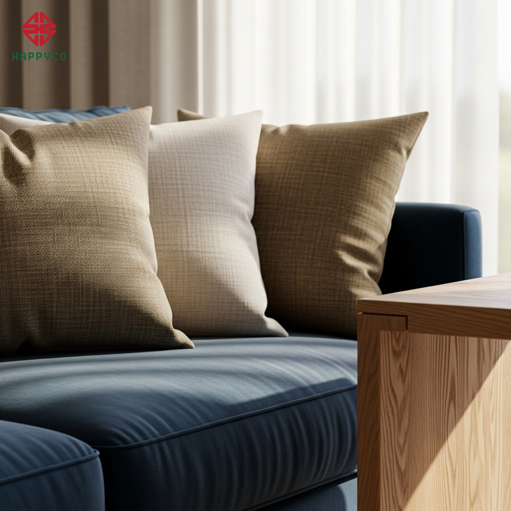 Ưu tiên gỗ và vải sợi tự nhiên: Happy Décor sử dụng các bề mặt gỗ mịn, vải lanh, hoặc nỉ cao cấp cho sofa và giường ngủ. Những chất liệu mang hơi thở tự nhiên này mang lại cảm giác ấm áp, giúp con người dễ dàng thả lỏng và cởi mở lòng mình hơn với những người thân yêu.