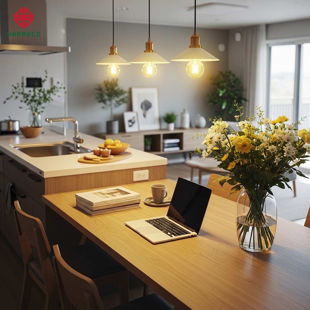 Khu vực làm việc mở: Thay vì nhốt mình trong phòng kín, một bàn làm việc dài tích hợp ở phòng khách hoặc gần bếp giúp cha mẹ có thể hỗ trợ con học bài trong khi vẫn xử lý được công việc cá nhân. Sự hiện diện song song này tạo ra cảm giác an tâm và gắn bó cho trẻ nhỏ.