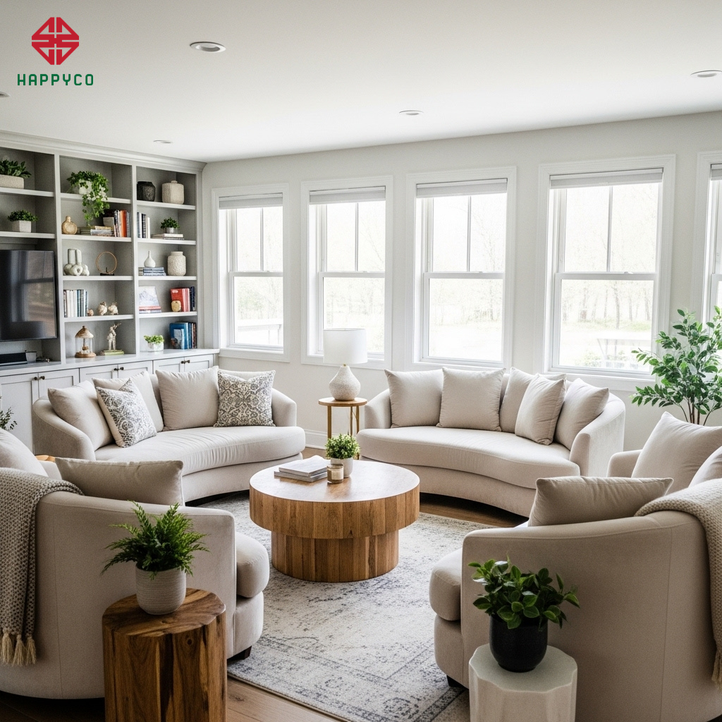 Bố trí sofa hướng tâm: Chúng tôi thay đổi cách sắp xếp ghế sofa theo hình tròn hoặc đối diện nhau qua một bàn trà gỗ mộc mạc. Cách bố trí này khuyến khích việc giao tiếp bằng mắt, khiến những câu chuyện sau giờ làm trở nên chân thành và ấm áp hơn.
