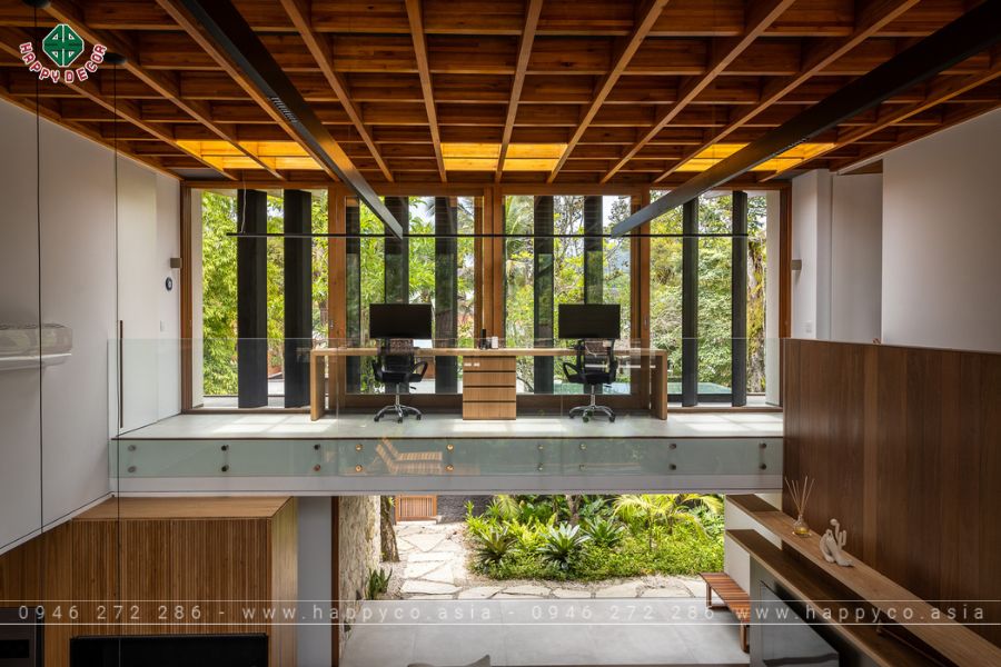 Một điểm thú vị của căn biệt thự là khu vực làm việc đặt tại tầng lửng, với bàn làm việc hướng ra cửa kính cao đón nắng và nhìn thẳng ra mảng xanh tươi mát. Nơi này được tách thành khu vực riêng, đảm bảo không làm gián đoạn dòng chảy không gian sống của gia đình.