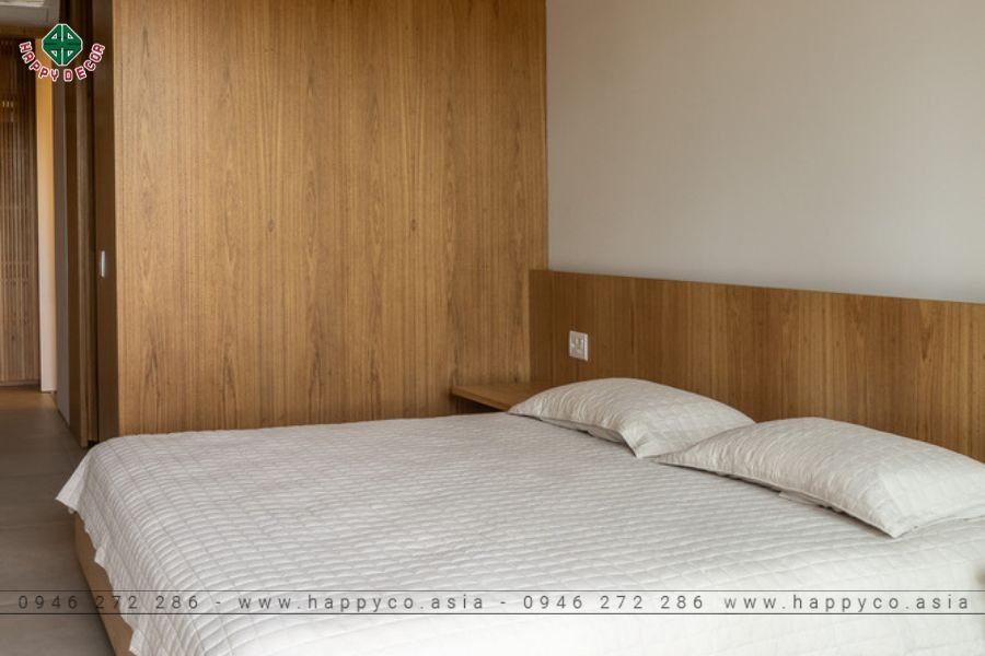 Phòng ngủ chính được thiết kế với tông màu gỗ làm chủ đạo, từ tường ốp, trần thả cho đến khung giường. Không có chi tiết thừa, không màu sắc lòe loẹt, chỉ có sự tĩnh lặng, thoáng đãng và dịu dàng của thiên nhiên len lỏi vào mỗi buổi sớm.