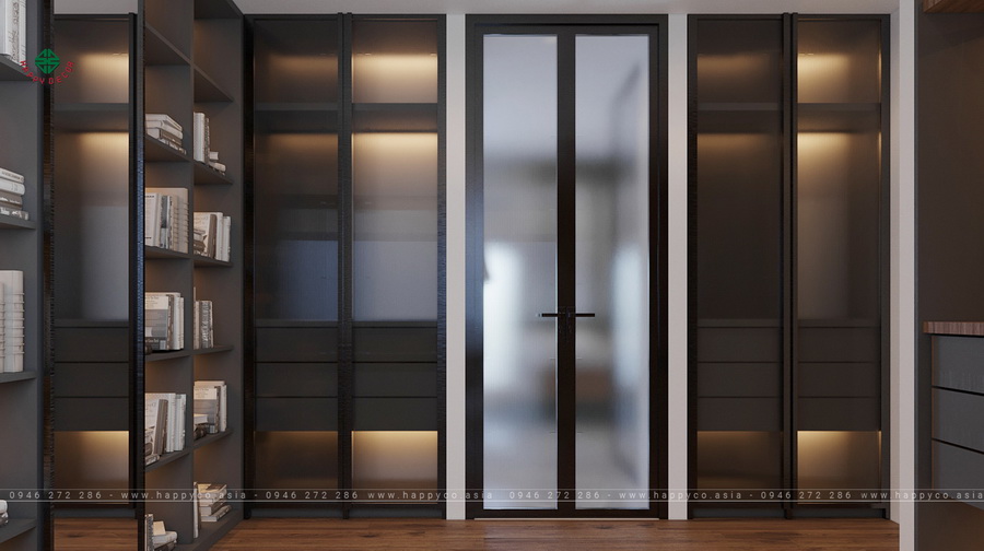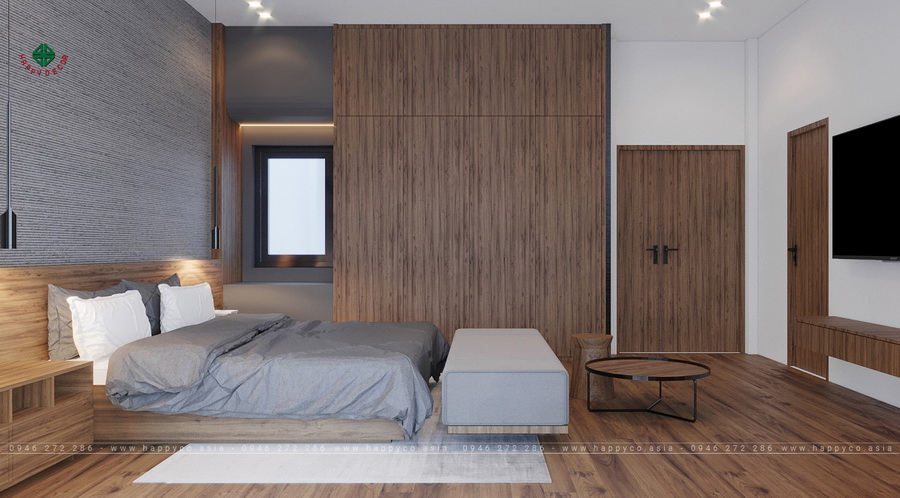 Ấn tượng nhất là thiết kế tab kéo đầu giường tích hợp kệ và tủ trang trí cũng như tính linh hoạt của các ngăn chứa đồ tích hợp. Tủ quần áo trần cao có kệ lớn để đựng quần áo, giày dép của gia chủ.