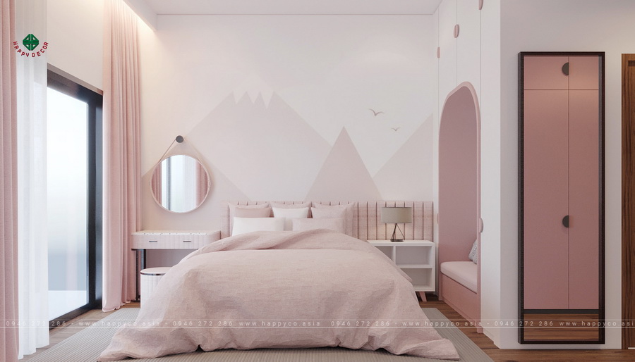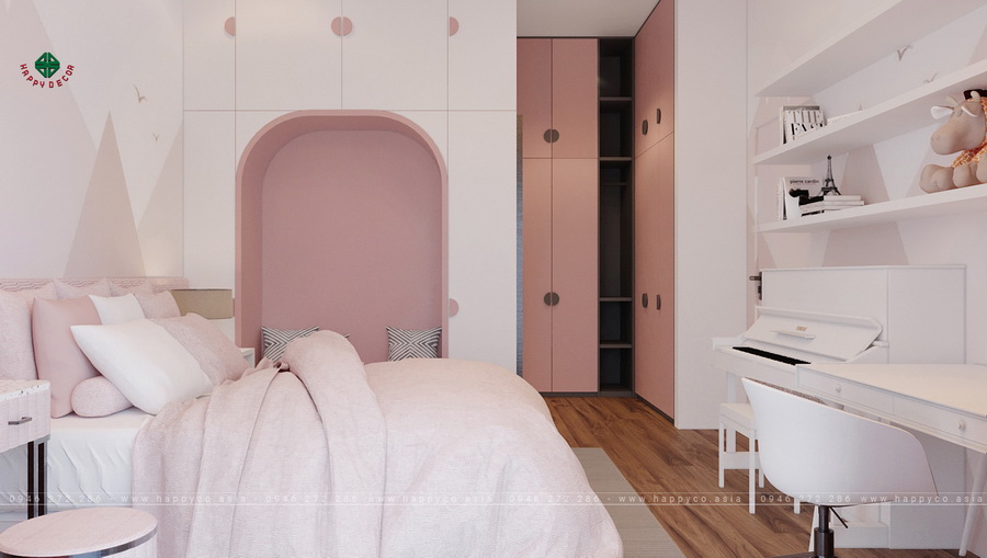 Ở không gian phòng ngủ con gái, sự thoải mái, thư giãn là ưu tiên hàng đầu. Tông màu hồng luôn mang đến cho người nhìn cảm giác gần gũi, nhẹ nhàng. Phòng ngủ không có quá nhiều đồ đạc nhưng vẫn có thể đáp ứng được những nhu cầu cơ bản của con gái