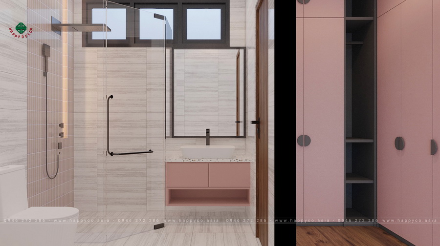 Tủ quần áo được thiết kế cạnh phòng tắm cùng tông màu hồng nhẹ nhàng giúp tiết kiệm diện tích mà vẫn đảm bảo sự thoải mái trong quá trình sử dụng.