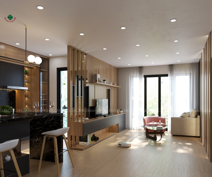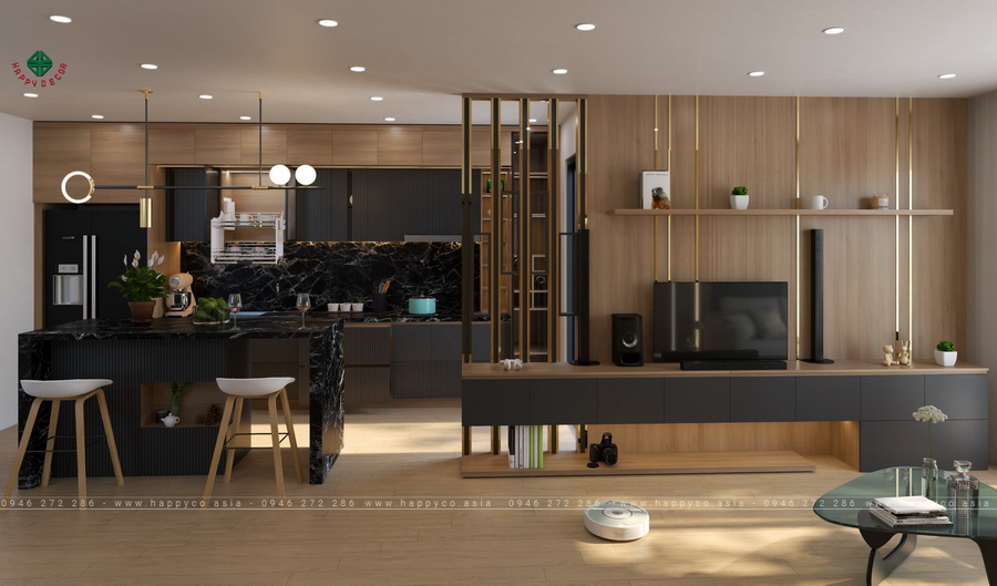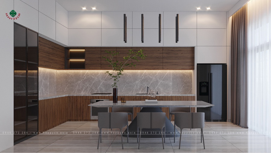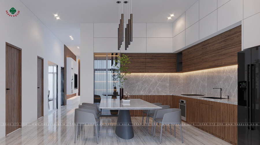 và xu hướng thiết kế nội thất nhà bếp Không gian hiện đại, rộng mở,đồ nội thất Happy Decor Kết quả là một không gian sống rộng rãi, thoáng mát và không kém phần sang trọng dành cho gia đình anh Hùng.