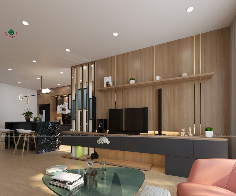 Nội thất phòng khách Ghế sofa màu hồng, bàn cà phê đều sang trọng. Điều đập vào mắt người nhìn chính là những chiếc tủ trang trí cao đến trần nhà với các ngăn chứa đồ phù hợp và đồ trang trí bắt mắt. Tận dụng tối đa ánh sáng tự nhiên nhờ thiết kế rèm 2 lớp màu trắng và xám. Đồng thời, thông qua thiết kế đèn LED và đèn trần, ánh sáng được phân bố đều đến mọi góc, không gian của căn phòng.