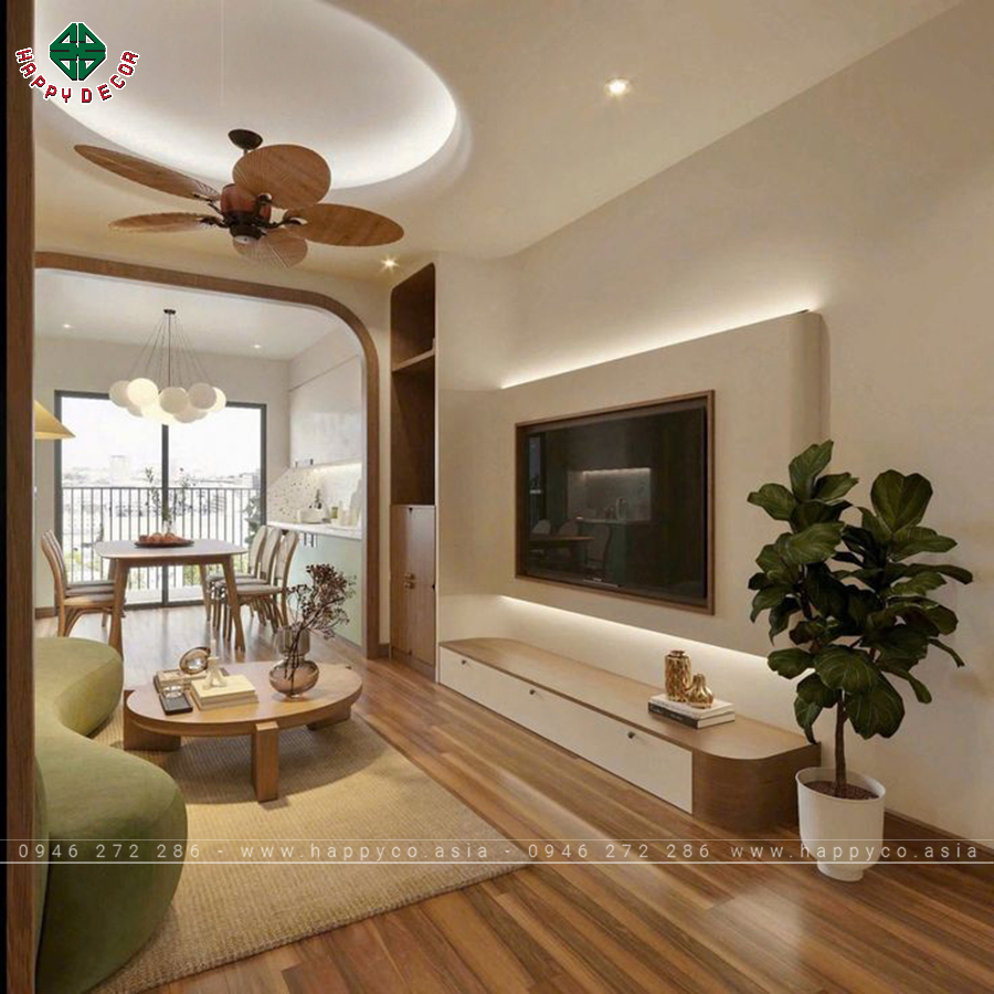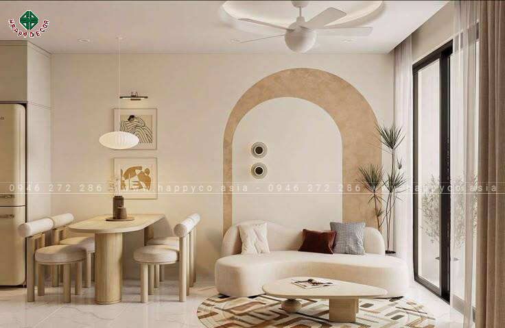 Màu sắc đóng vai trò quan trọng trong việc “nới rộng” không gian. Sơn tường trắng, xám nhạt kết hợp với nội thất tối giản như bàn ghế gỗ mảnh sẽ khiến căn hộ của bạn trông rộng rãi hơn. Đừng quên thêm một chút điểm nhấn bằng gối ôm màu pastel hay thảm trải sàn họa tiết nhẹ nhàng. Đây là cách mà Happy Decor, một đơn vị thiết kế nội thất uy tín, thường gợi ý cho khách hàng để vừa đẹp mắt vừa tối ưu diện tích.