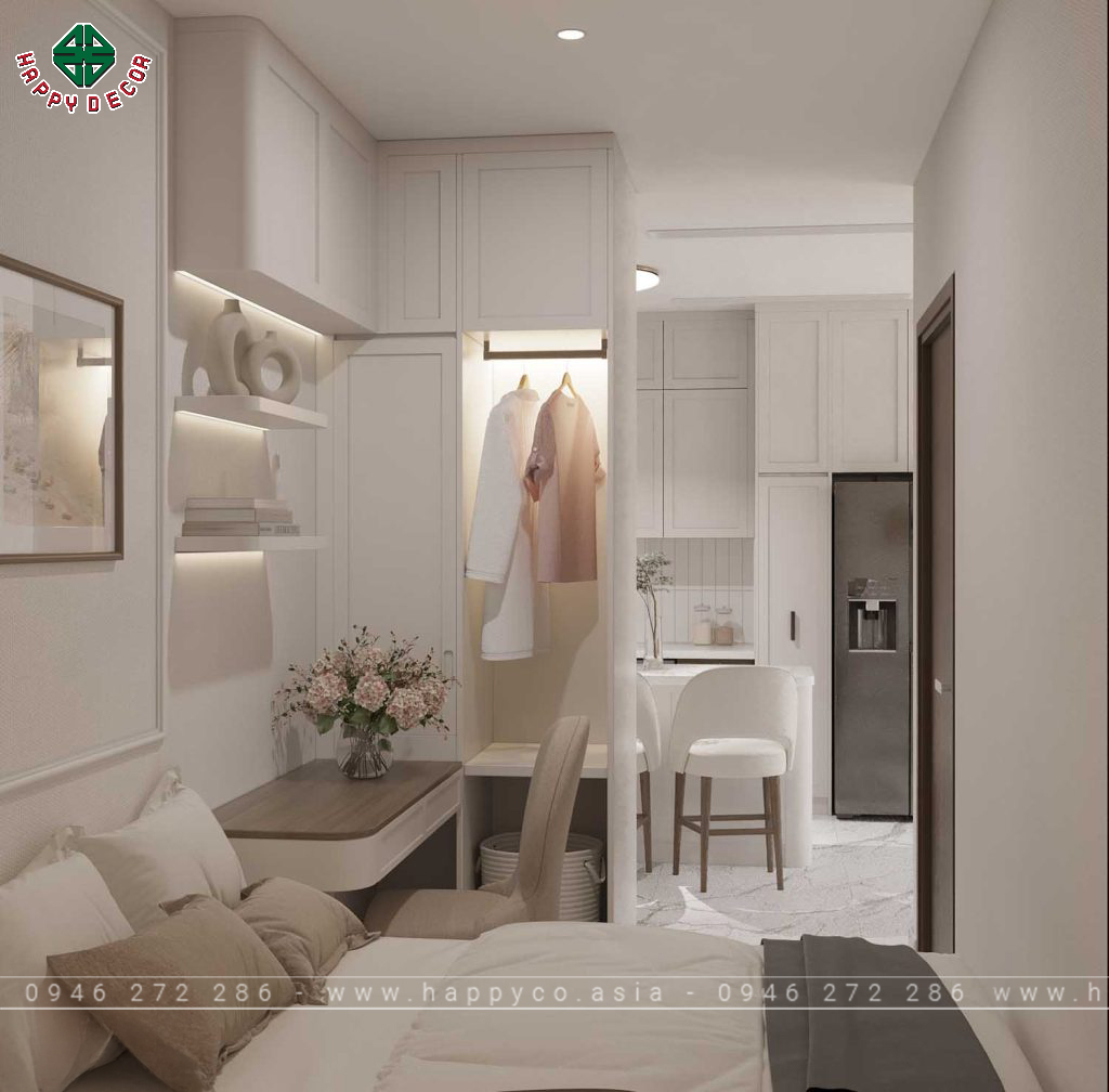 Phòng ngủ 1 được thiết kế dạng 1+1 với vách ngăn khéo léo, tạo không gian riêng tư mà vẫn thoáng đãng. Giường bục thông minh tích hợp tủ lưu trữ bên dưới, tối ưu diện tích và giữ sự ngăn nắp đặc trưng của nội thất chung cư hiện đại. Tông màu trắng, xám nhạt hay be mang lại cảm giác dịu mắt, xua tan sự chật chội trong không gian nhỏ.