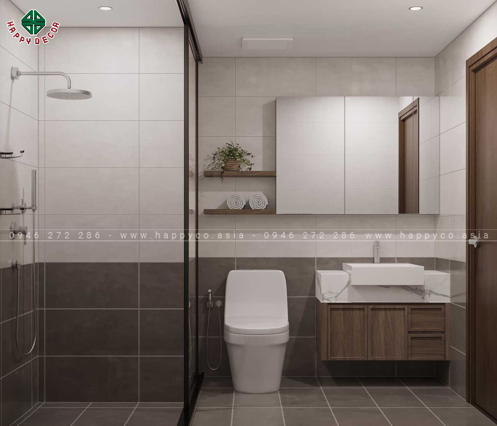 Nhà vệ sinh được lát gạch đồng đều, sử dụng bồn rửa mặt, kệ và tủ tối giản nhưng đầy đủ chức năng. Hệ tủ lưu trữ bên dưới gọn gàng, kết hợp gương lớn tạo chiều sâu, giúp không gian trông rộng rãi hơn. Thiết kế này vừa đáp ứng nhu cầu sử dụng vừa mang lại sự thoải mái, tiện nghi.