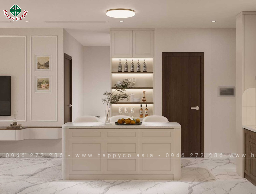 Điểm nhấn là bàn ăn 2 trong 1, vừa làm bàn ăn vừa tích hợp bàn đảo bếp, mang lại sự linh hoạt cho gia đình nhỏ. Thiết kế đường cong mềm mại của bàn ghế tạo cảm giác gần gũi, cân bằng giữa hiện đại và ấm áp. Hệ tủ rượu đồng bộ với các ngăn kệ đối xứng, trưng bày ly pha lê hay chai rượu, vừa đẹp mắt vừa gọn gàng.