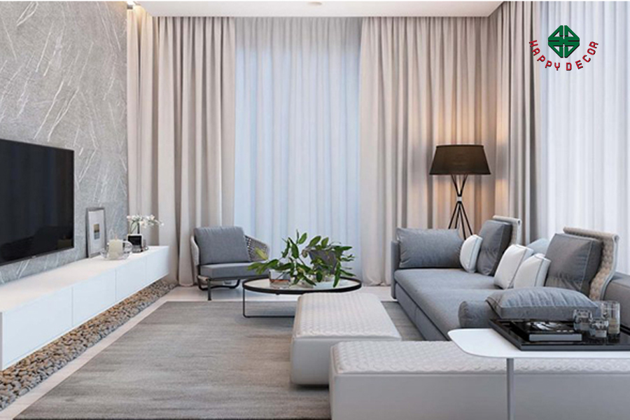 Sự kết hợp hài hòa giữa những gam màu trung tính nhẹ nhàng thanh lịch từ màn treo cửa, bộ ghế sofa,.. đến bức tường tạo ra không gian sống thoải mái và đẳng cấp.