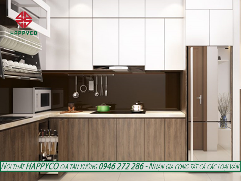 Với sự kết hợp trong thi công nội thất gỗ chung cư giữa màu gỗ óc chó và và màu trắng, đã đem đến cho không gian bếp có sự ấm cúng và thoải mái. Đêm đến sự thoải mái, và tiện nợi cho người nầu ăn. Đem đến bữa cơm ngon cho gia đình sau giờ làm việc của một ngày trôi qua.