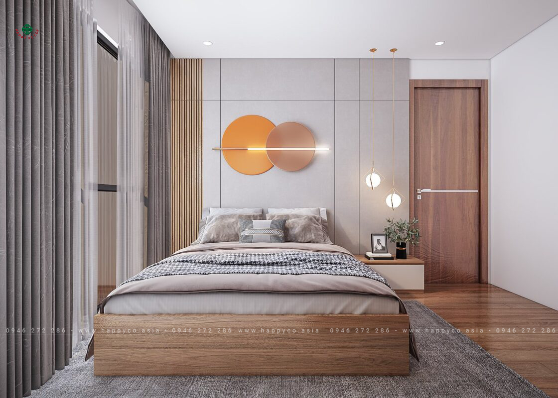 Màu trắng chủ đạo xen kẽ tinh tế với màu nâu của gỗ và màu xám của rèm cửa tạo cảm giác nhẹ nhàng, thoải mái cho căn phòng. Tận dụng ánh sáng tự nhiên giúp căn phòng trở nên nổi bật và thoáng mát hơn vào ban ngày, mang lại giấc ngủ thoải mái và thức dậy sảng khoái.